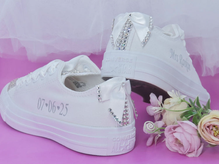 For the modern bride, our personalised Converse wedding trainers are sure to make a statement. Handcrafted with the finest sparkling crystals and a crystal-edged bow back, these exquisite personalised trainers offer an elegant alternative to traditional bridal shoes. Make your special day even more unique with these sparkling wedding Converse.